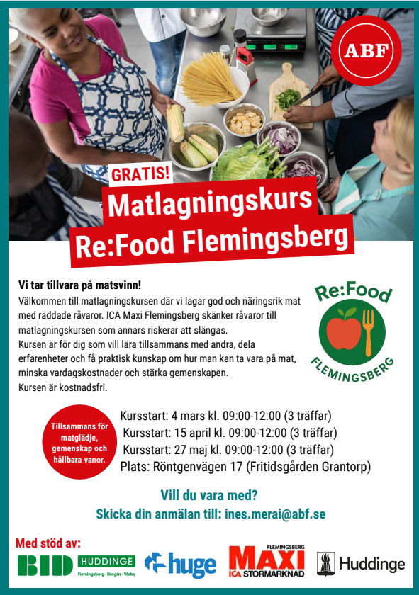 Re:Food Flemingsberg är matlagningskurser med räddade råvaror som annars riskerar att slängas. Kursen riktar sig till boende i området som vill laga mat tillsammans med andra, stärka gemenskapen, lära sig svenska och bryta ensamhet. Maten som tillagas blir till matlådor som deltagarna får ta med sig hem. Re:Food Flemingsberg bidrar på så sätt både till ekologisk- och social hållbarhet.